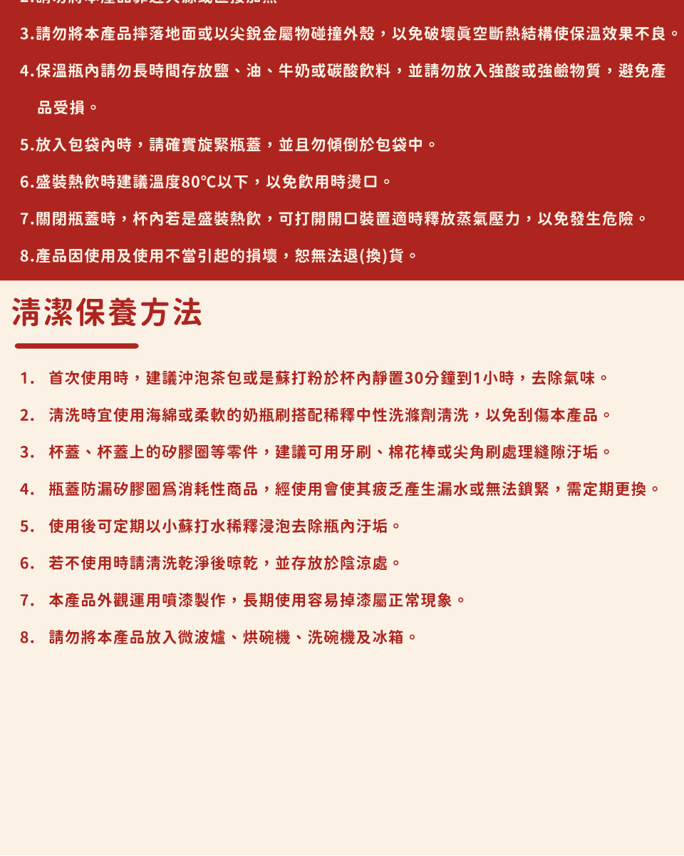 4.保溫瓶內請勿長時間存放鹽、油、牛奶或碳酸飲料,並請勿放入強酸或