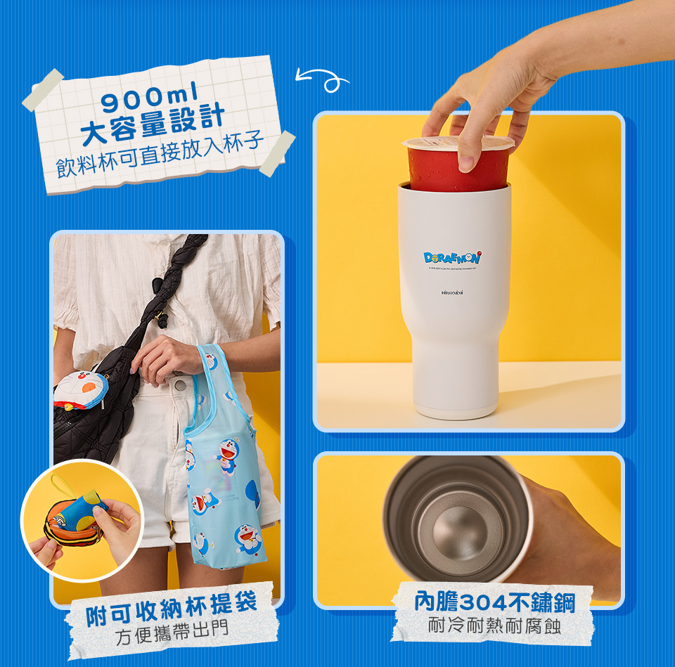 瓶身容量:900毫升 杯身材質:內304不鏽鋼/外201不鏽鋼 杯蓋材質:塑膠(PP、SK)、矽膠 耐熱:80度C 提袋材質:滌綸 掛飾材質:滌綸、聚酯纖維 商品規格: 杯子尺寸:7.4X10.6X21.3cm 提袋尺寸:16.5X36X7.5公分±3% 掛飾尺寸:9.5X9cm 原產地:中國