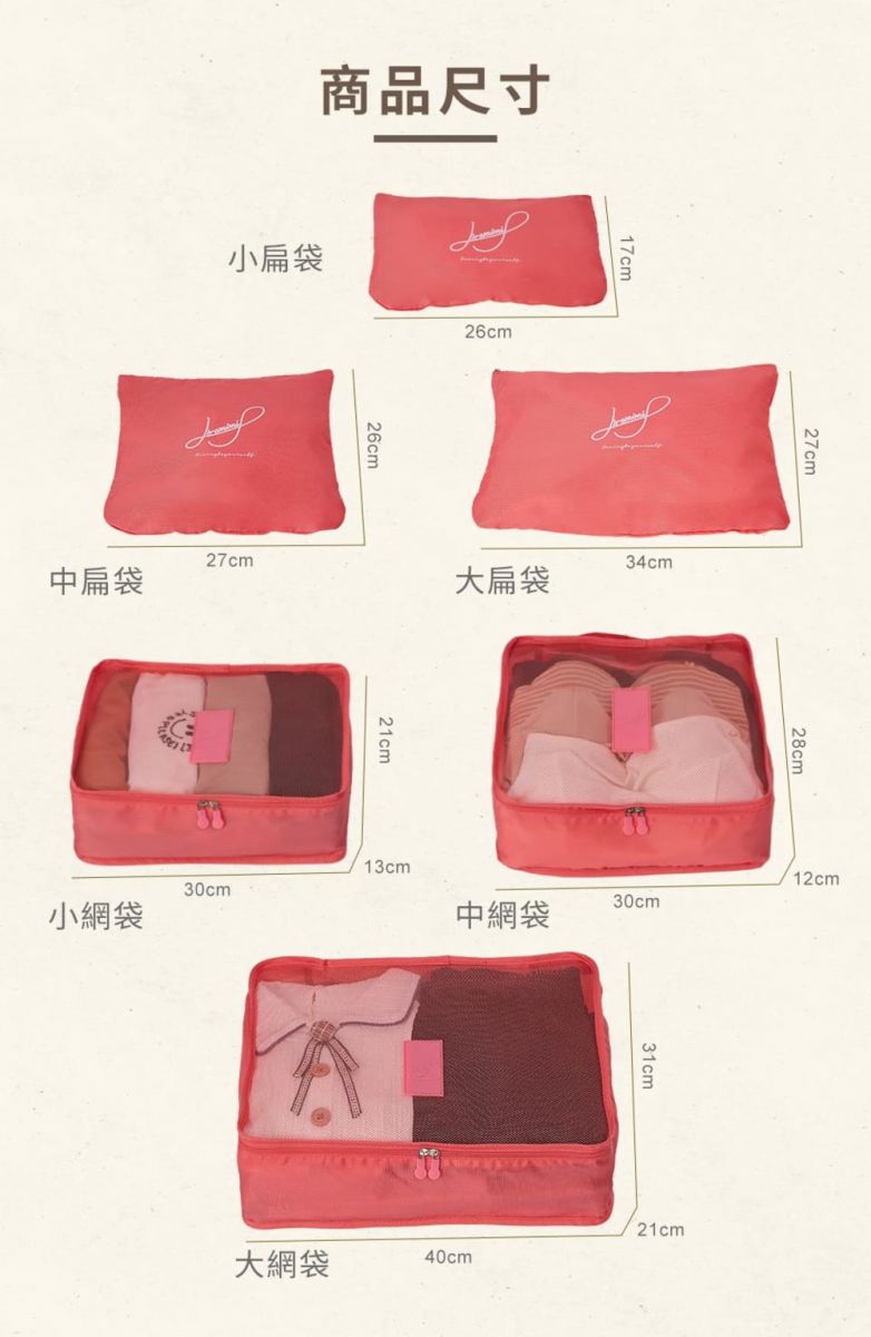 尺寸: 小扁袋26x17cm;忠扁袋27x26cm;大扁袋34x27cm;小網袋30x21x13cm;中網袋30x28x12cm;大網袋40x31x21cm
