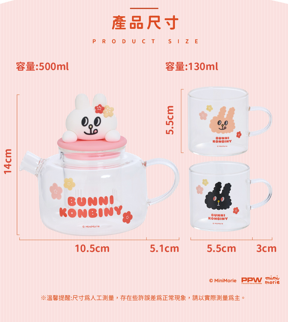 產品尺寸:水壺/15.6x14cm(500ml);杯子/5.5x5.5cm(130ml)