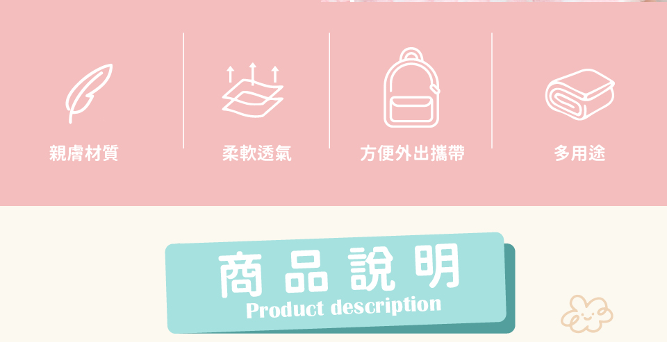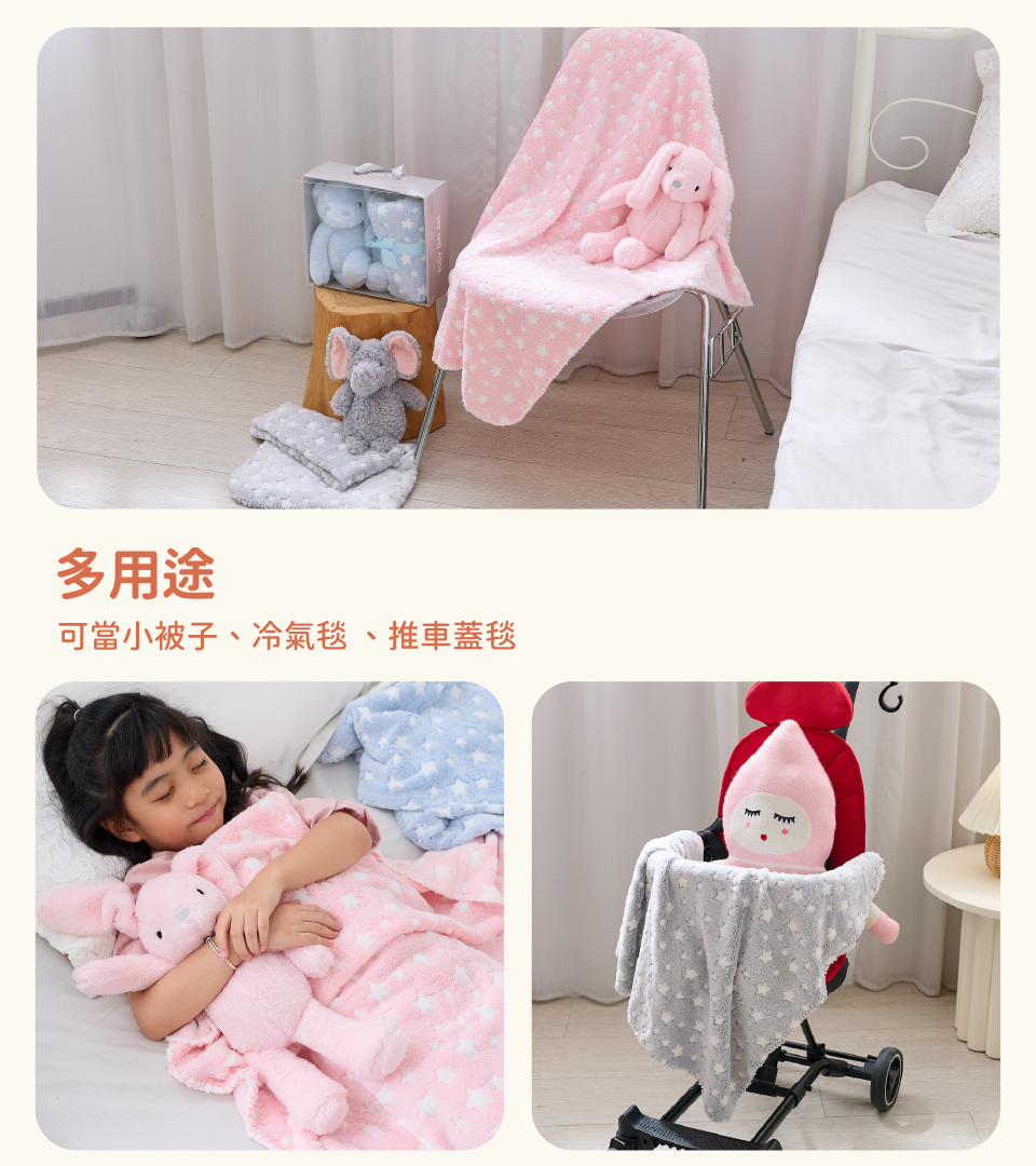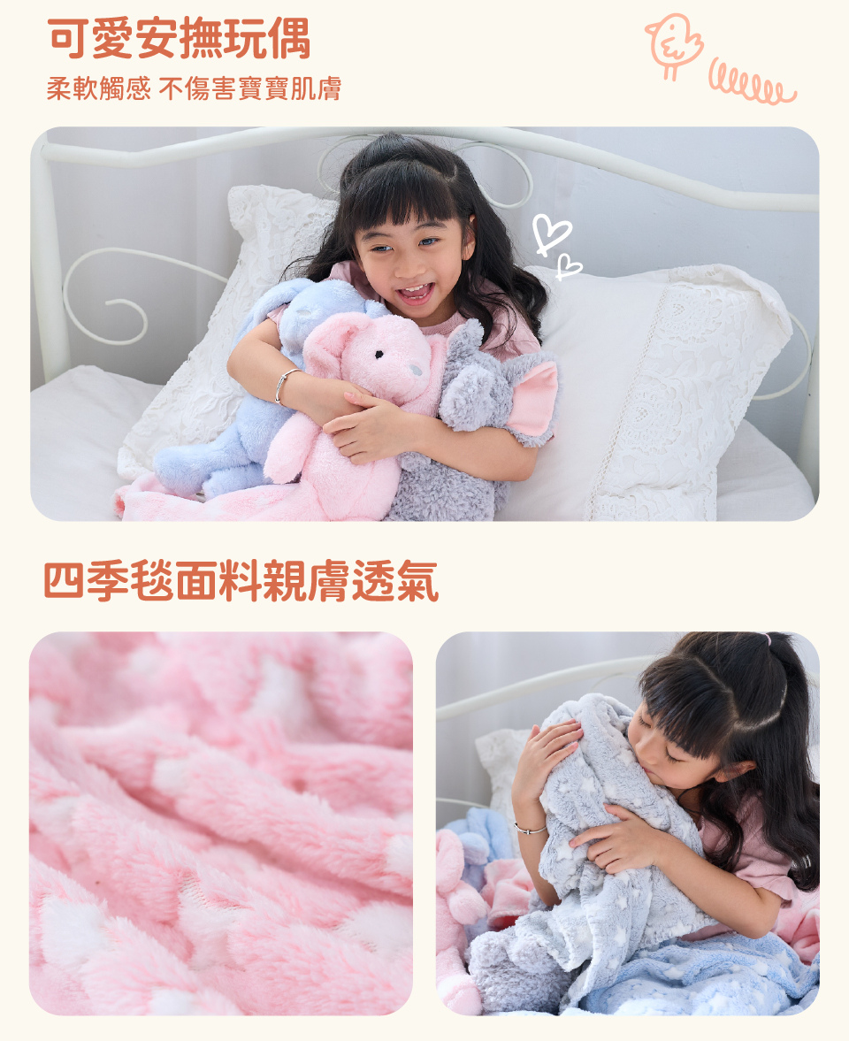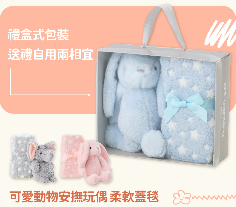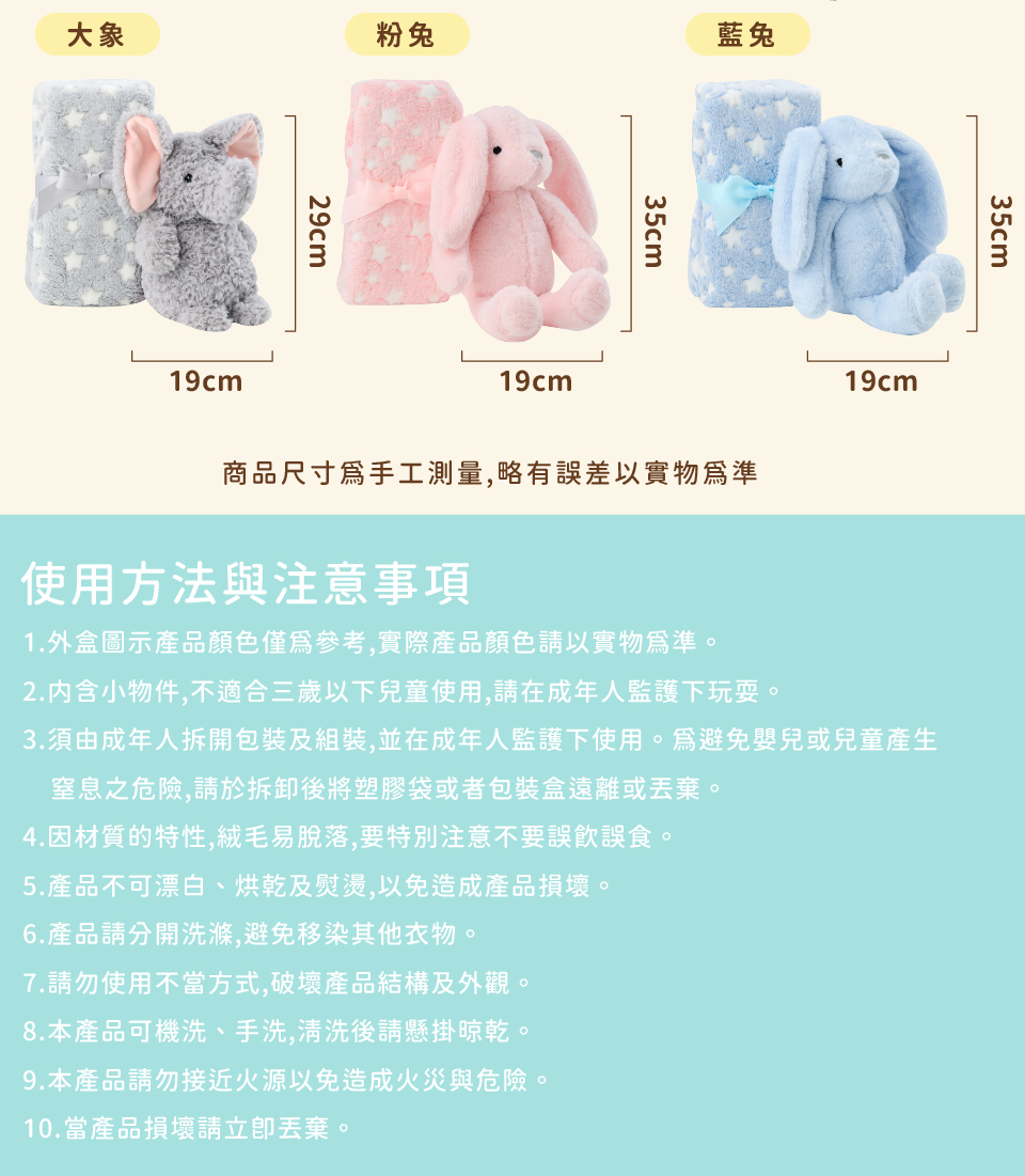 材質:兔子安撫娃娃:100%聚酯纖維 大象安撫娃娃:100%聚酯纖維 / 四季毯:100%聚酯纖維