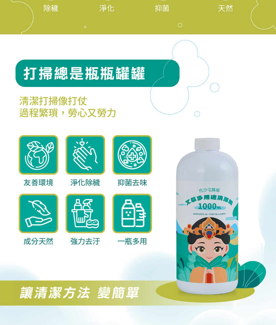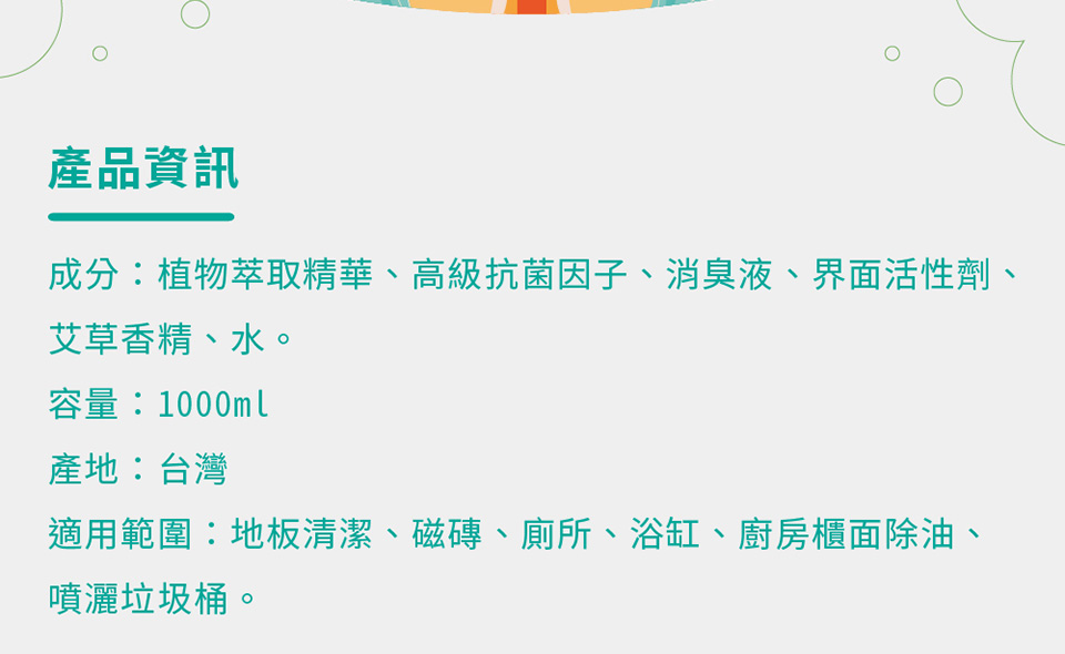 成分:植物萃取精華、高級抗菌因子、消臭液、界面活性劑、艾草香精、水。