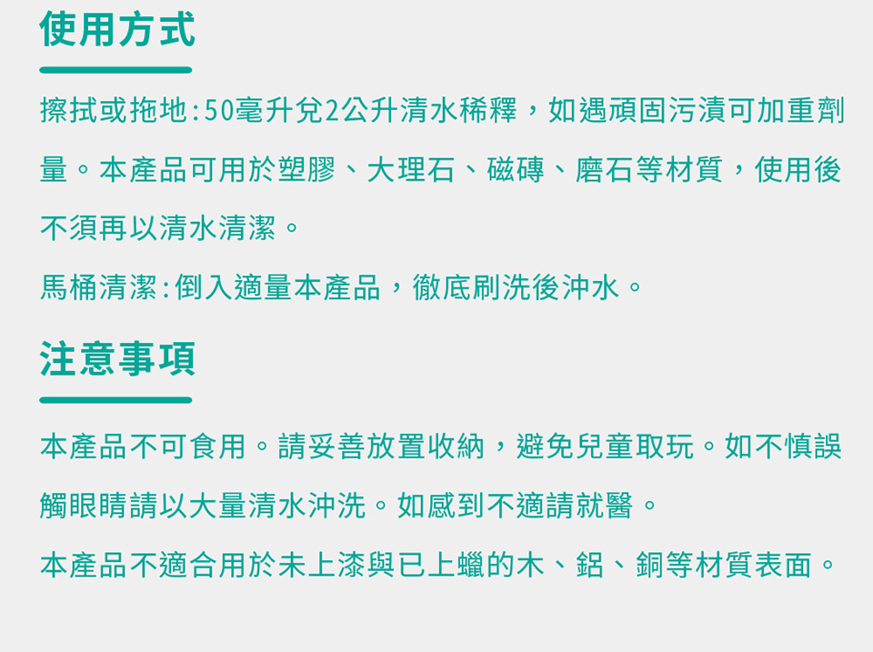 擦拭或拖地:50毫升兌2公升清水稀釋,如遇頑固污漬可加重劑量。本產品可用於塑膠、大理石、磁磚、磨石等材質,使用後不須再以清水清潔。